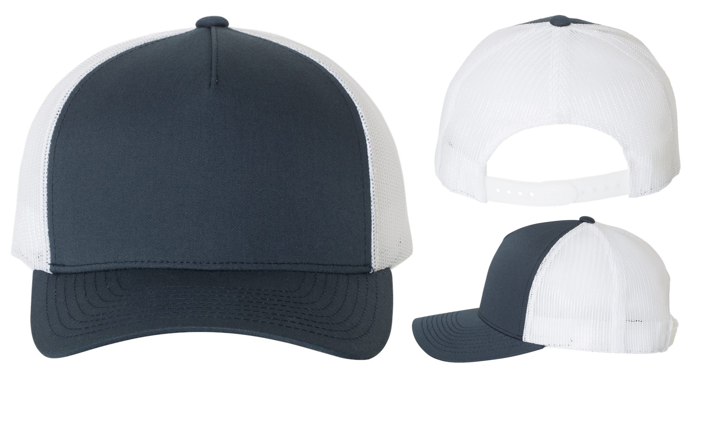 The Yupoong 6006, a Five-Panel Trucker Cap, features a high-profile, structured design with a mesh back and adjustable snap closure for breathability and comfort.