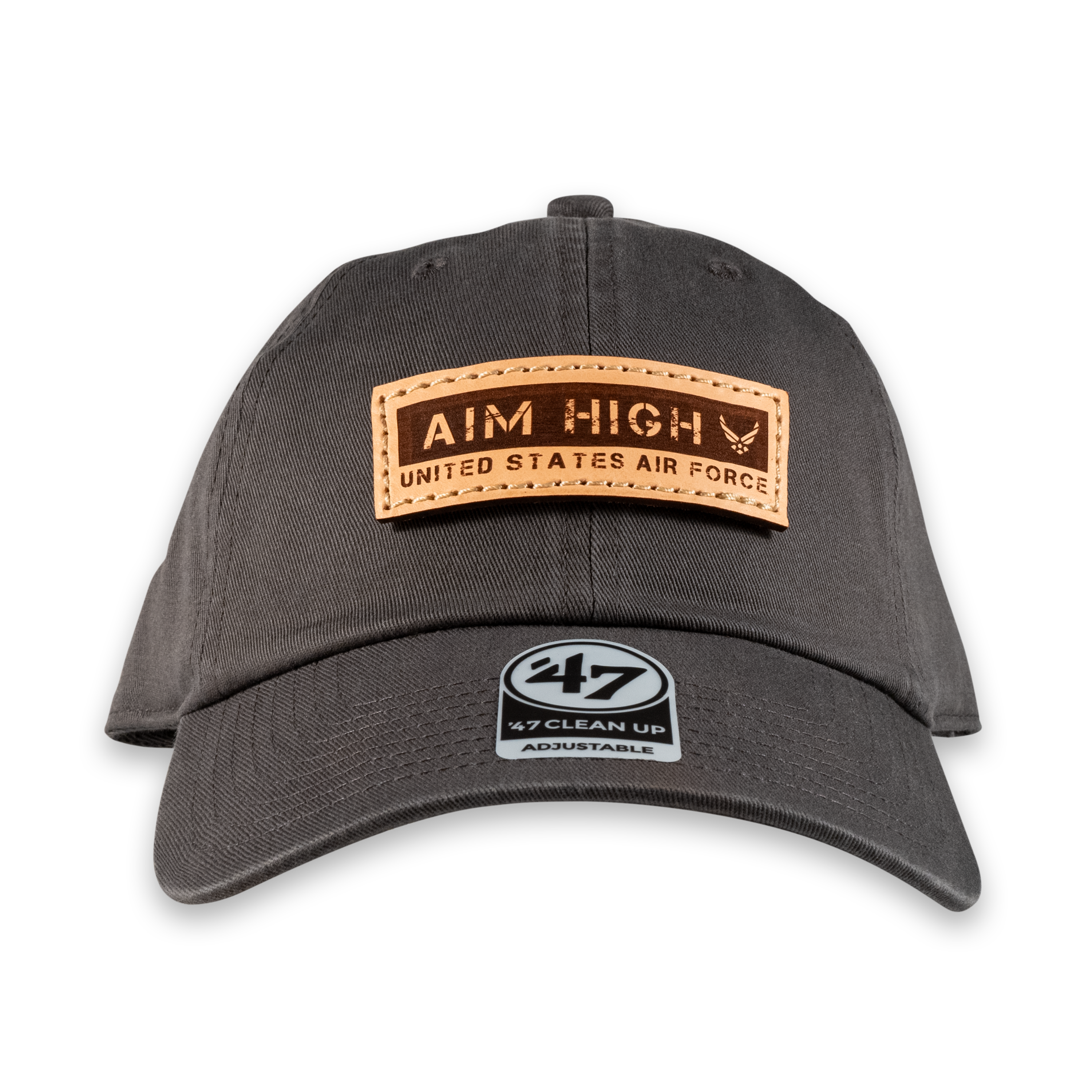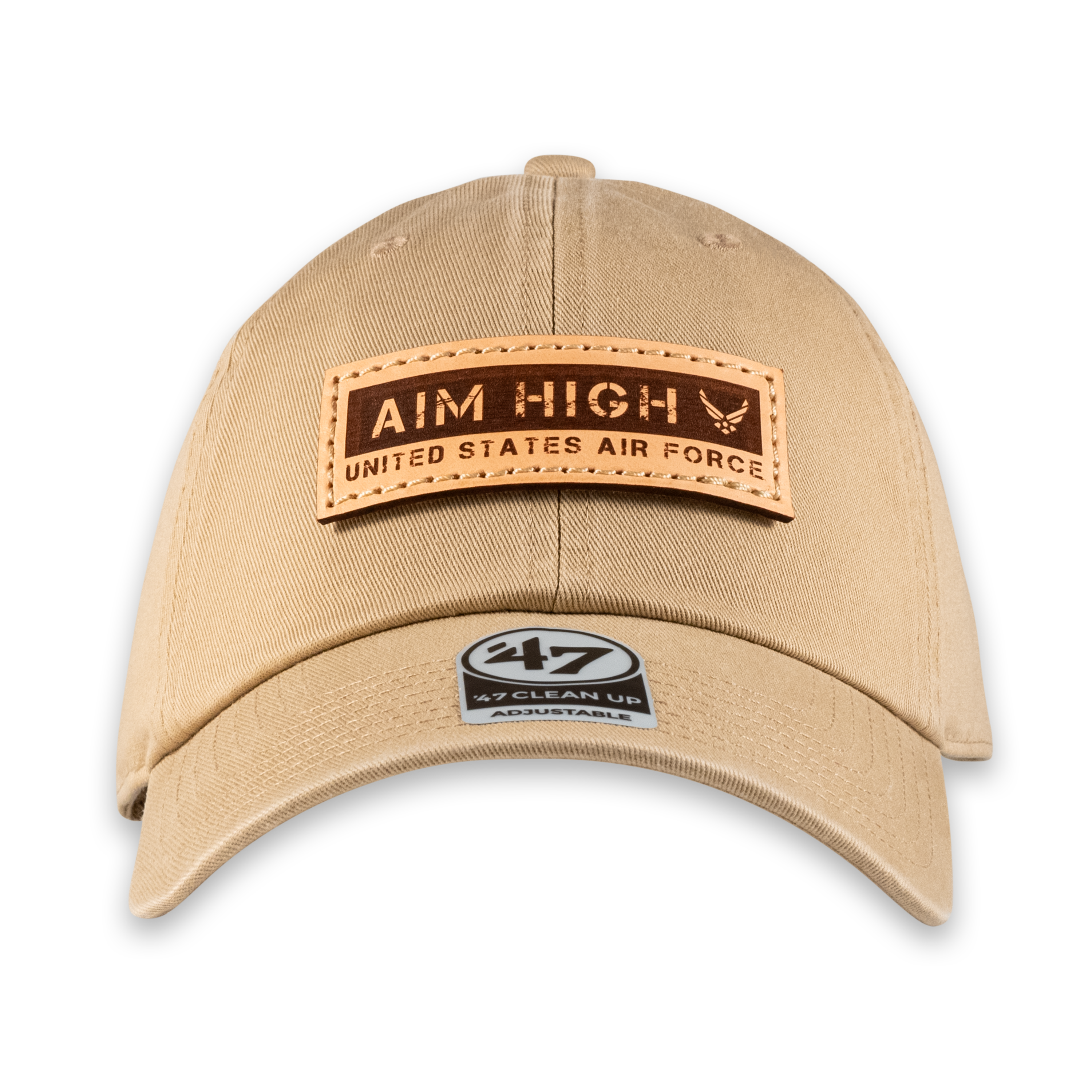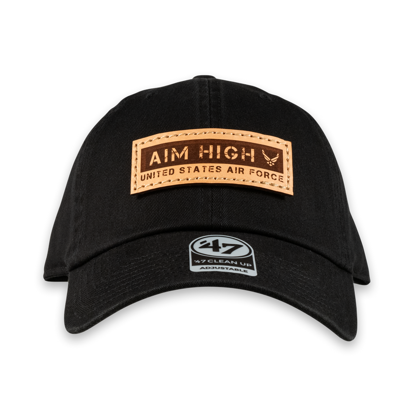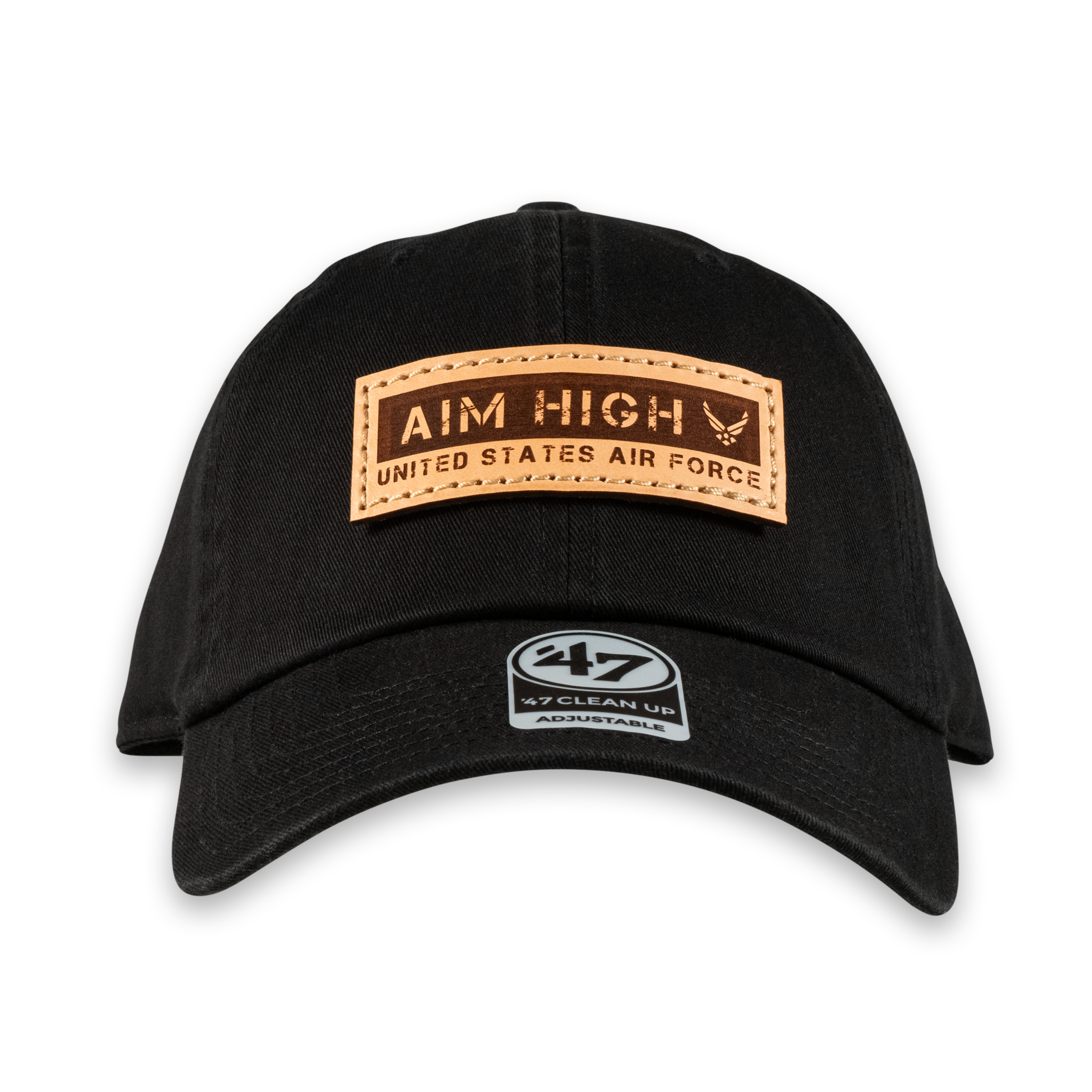 Hand Stitched Aim High Rectangle Custom Leather Patch Hat. Officially licensed by the U.S. Air Force.