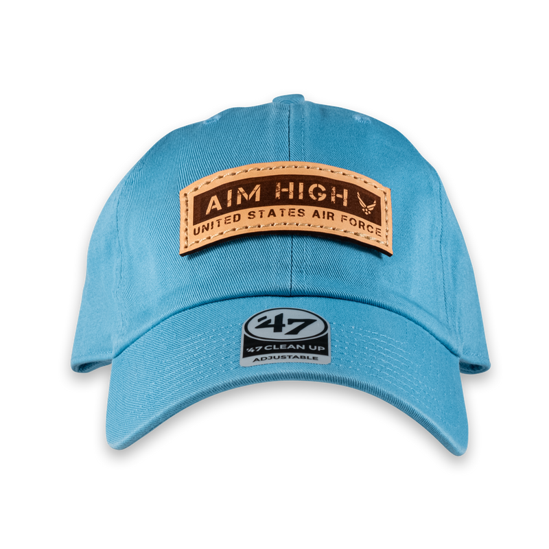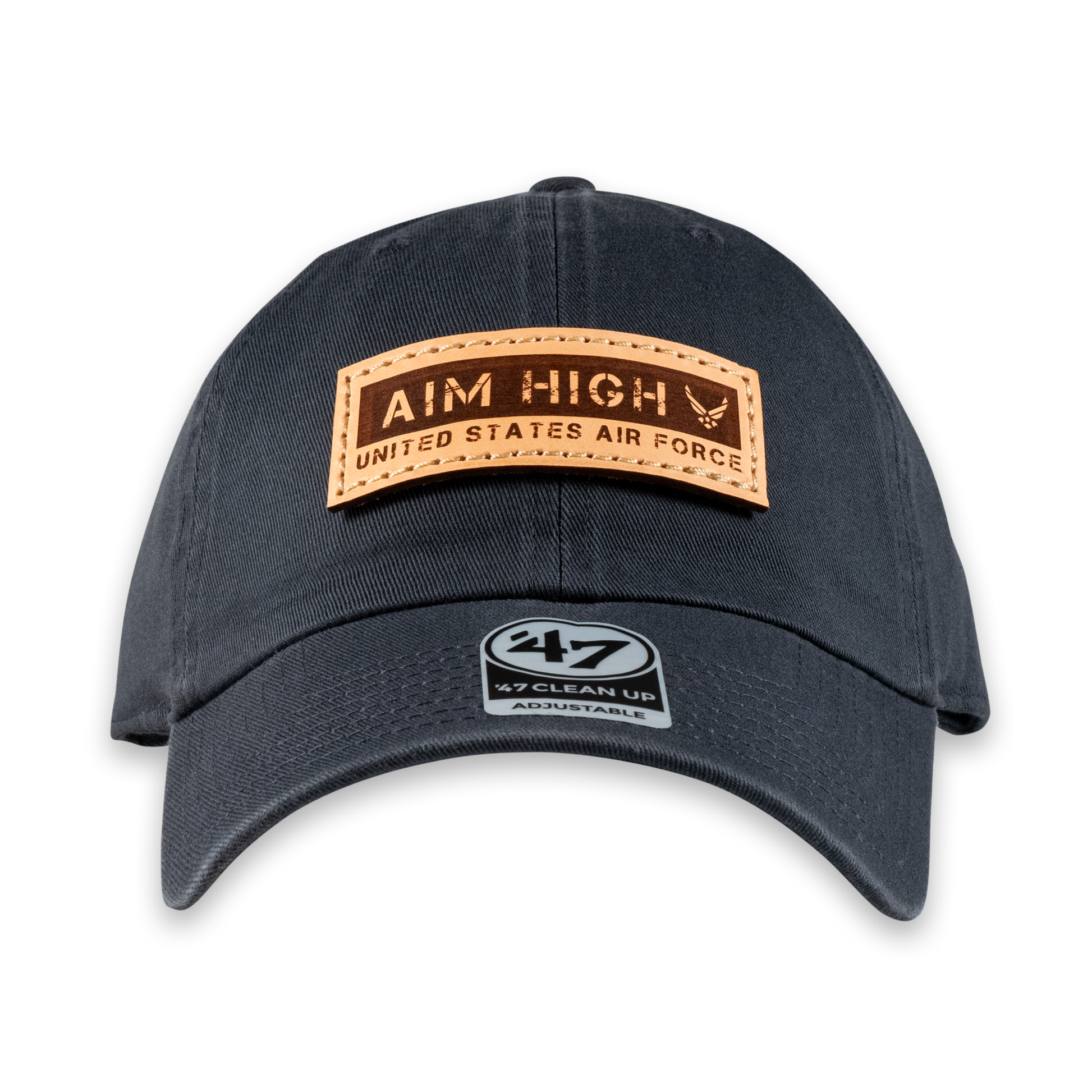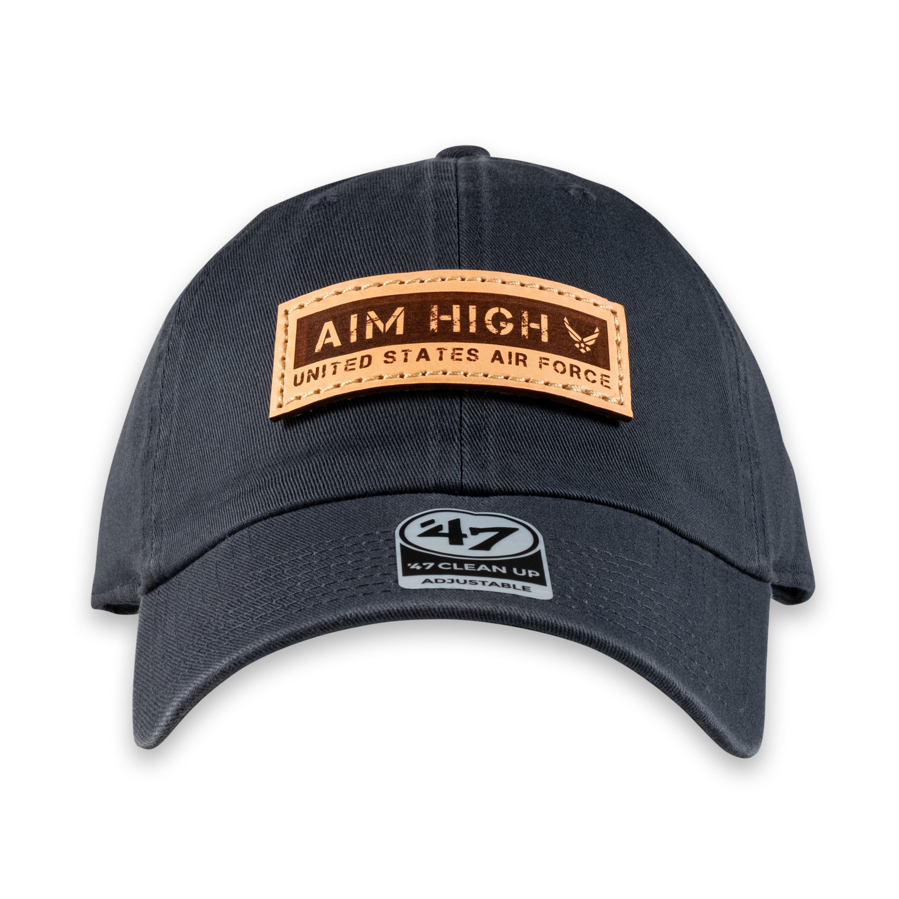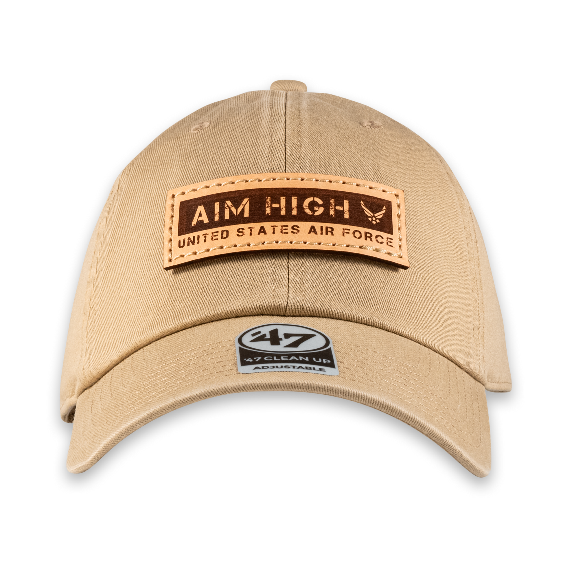 Hand Stitched Aim High Rectangle Custom Leather Patch Hat. Officially licensed by the U.S. Air Force.