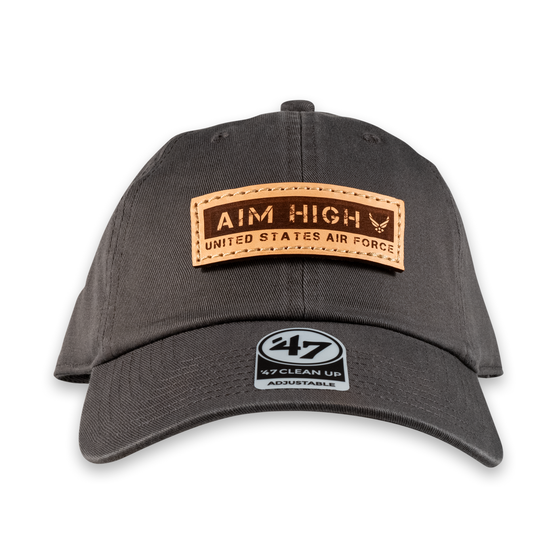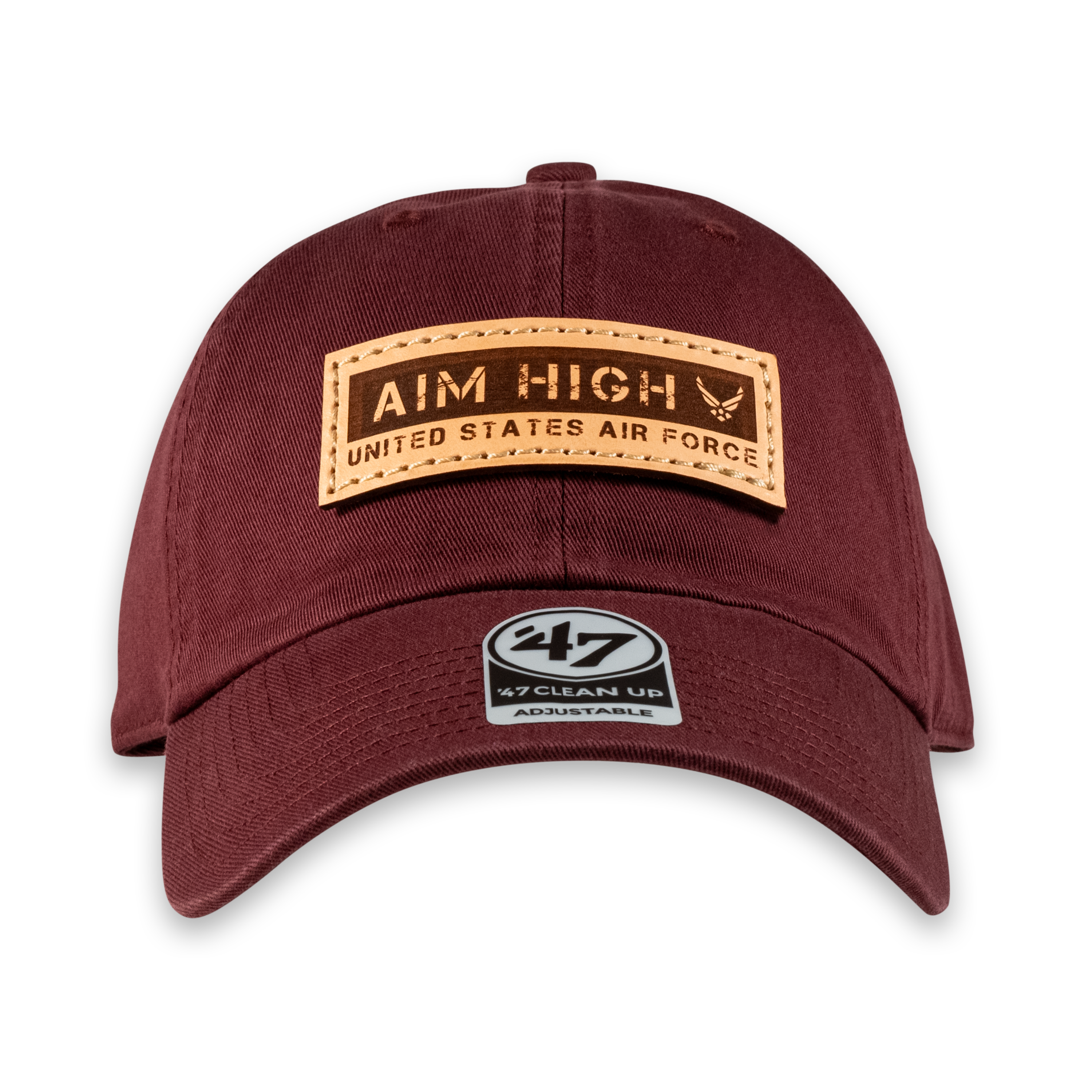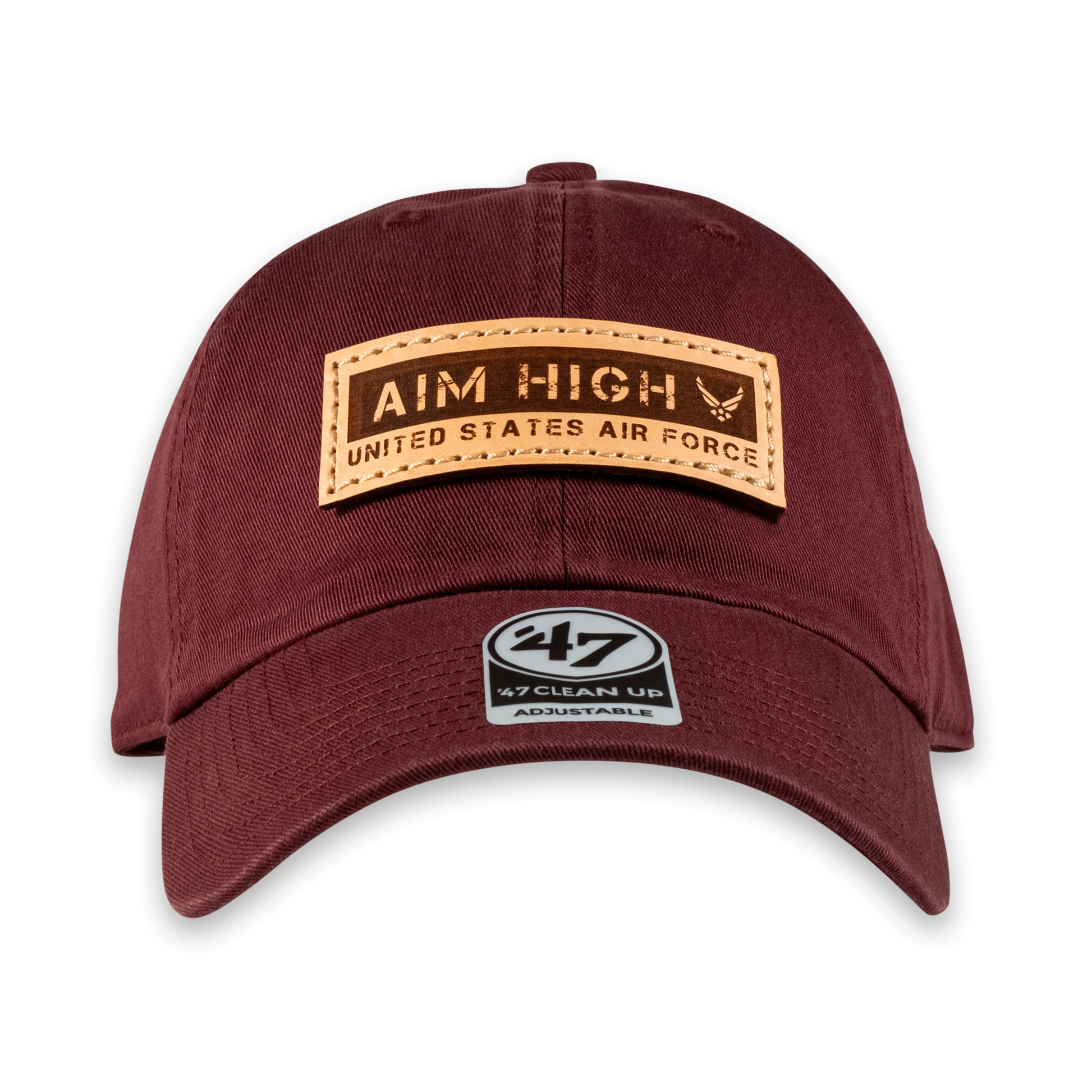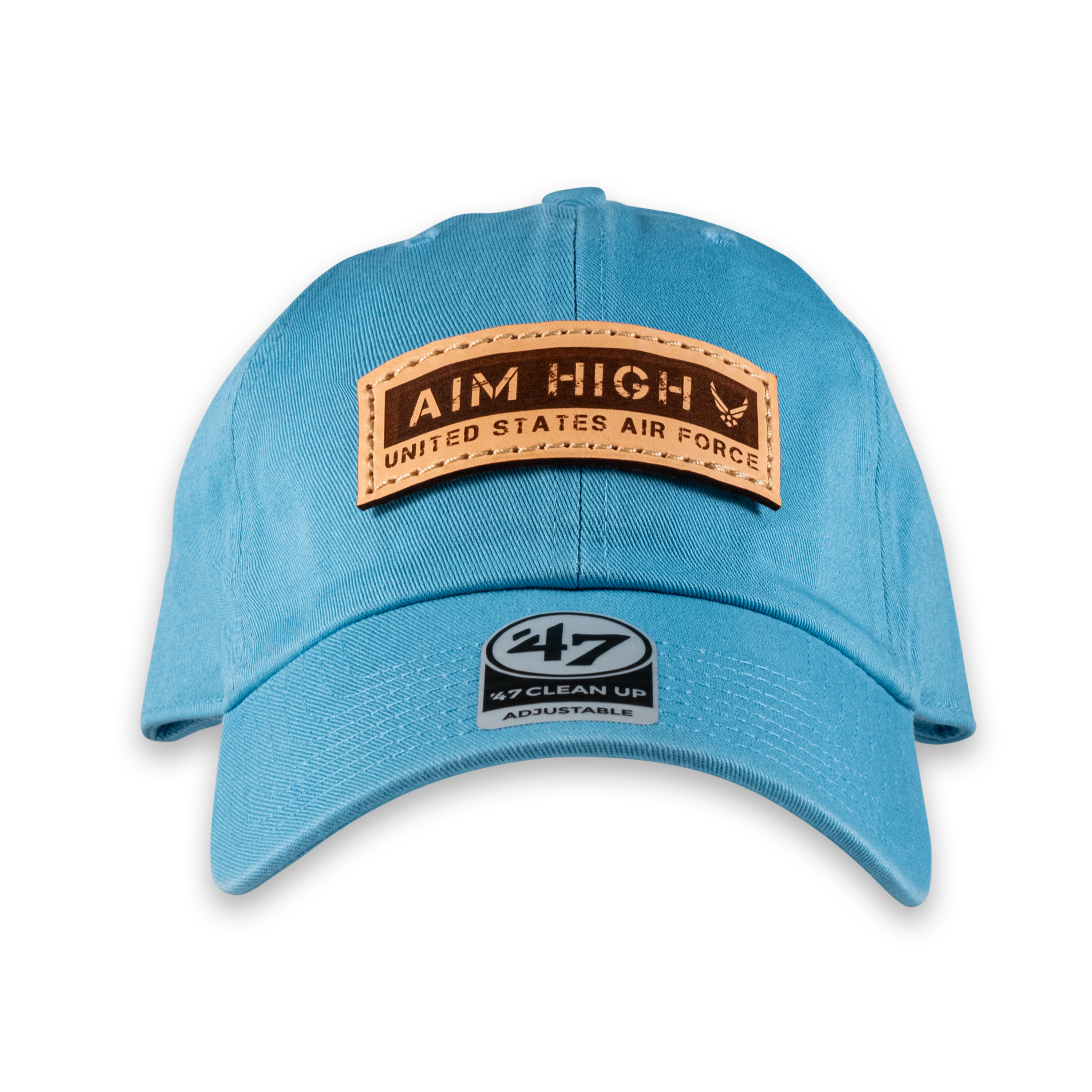Hand Stitched Aim High Rectangle Custom Leather Patch Hat. Officially licensed by the U.S. Air Force.