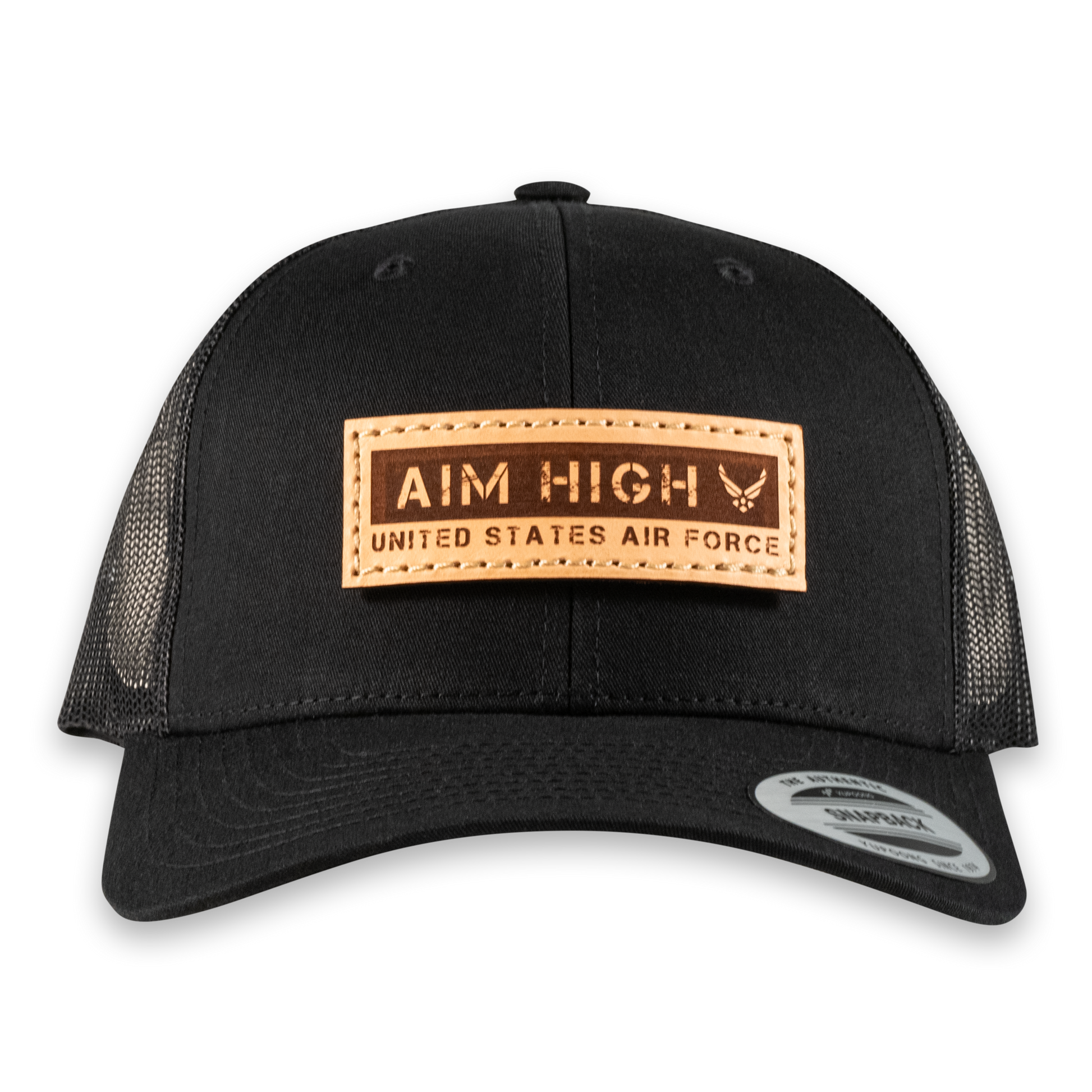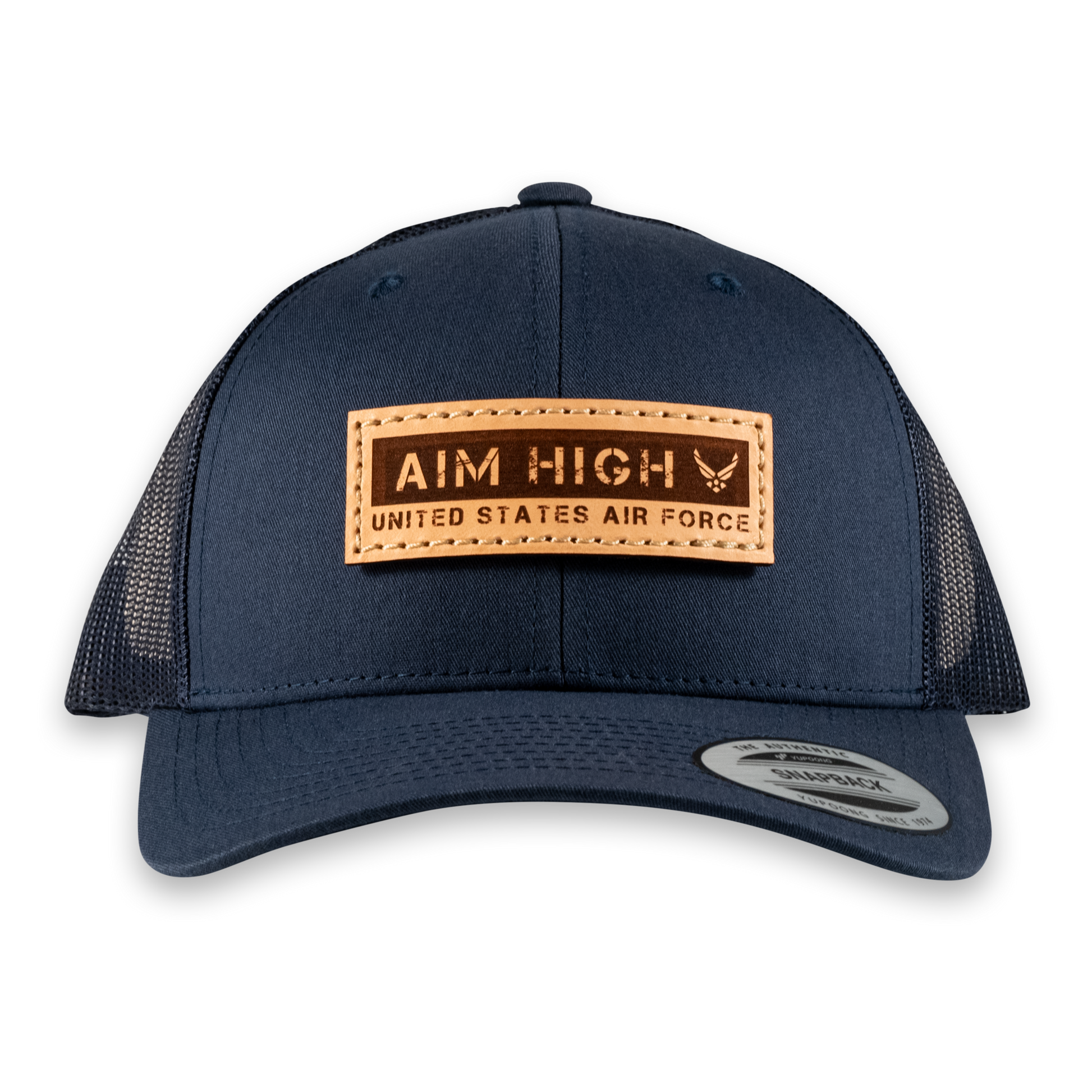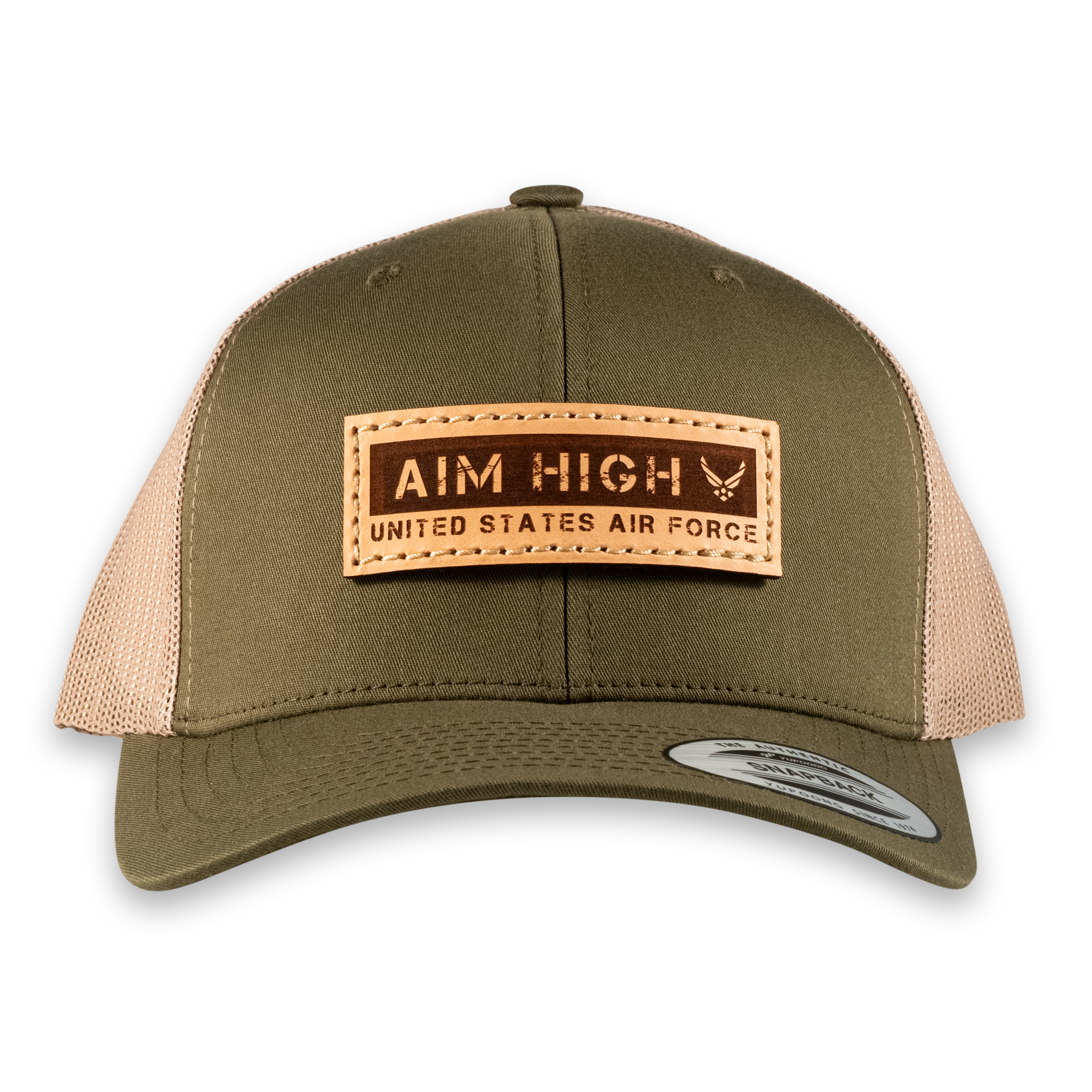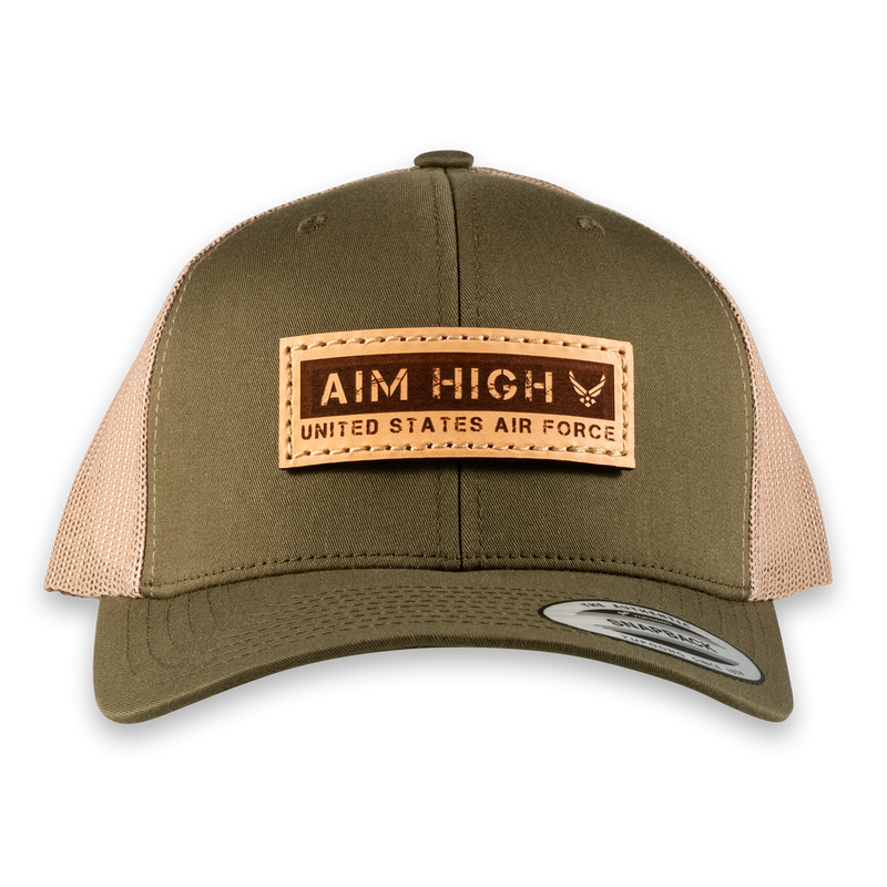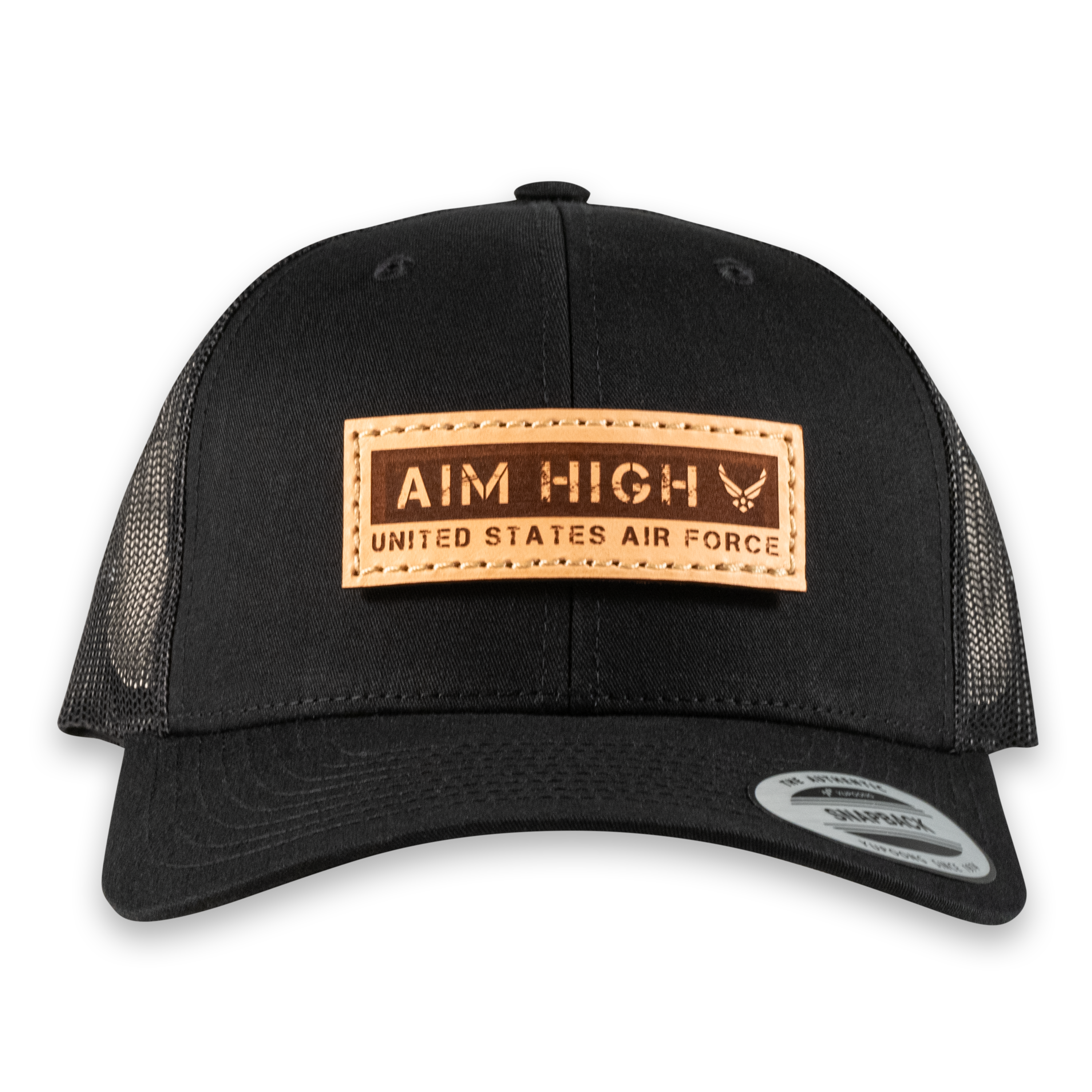 Hand Stitched Aim High Rectangle Custom Leather Patch Hat. Officially licensed by the U.S. Air Force.