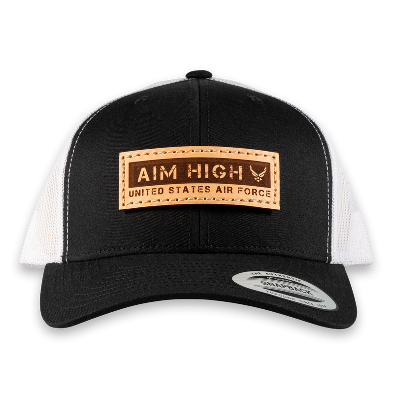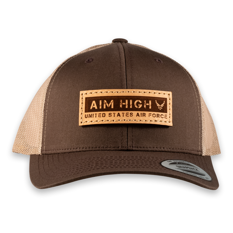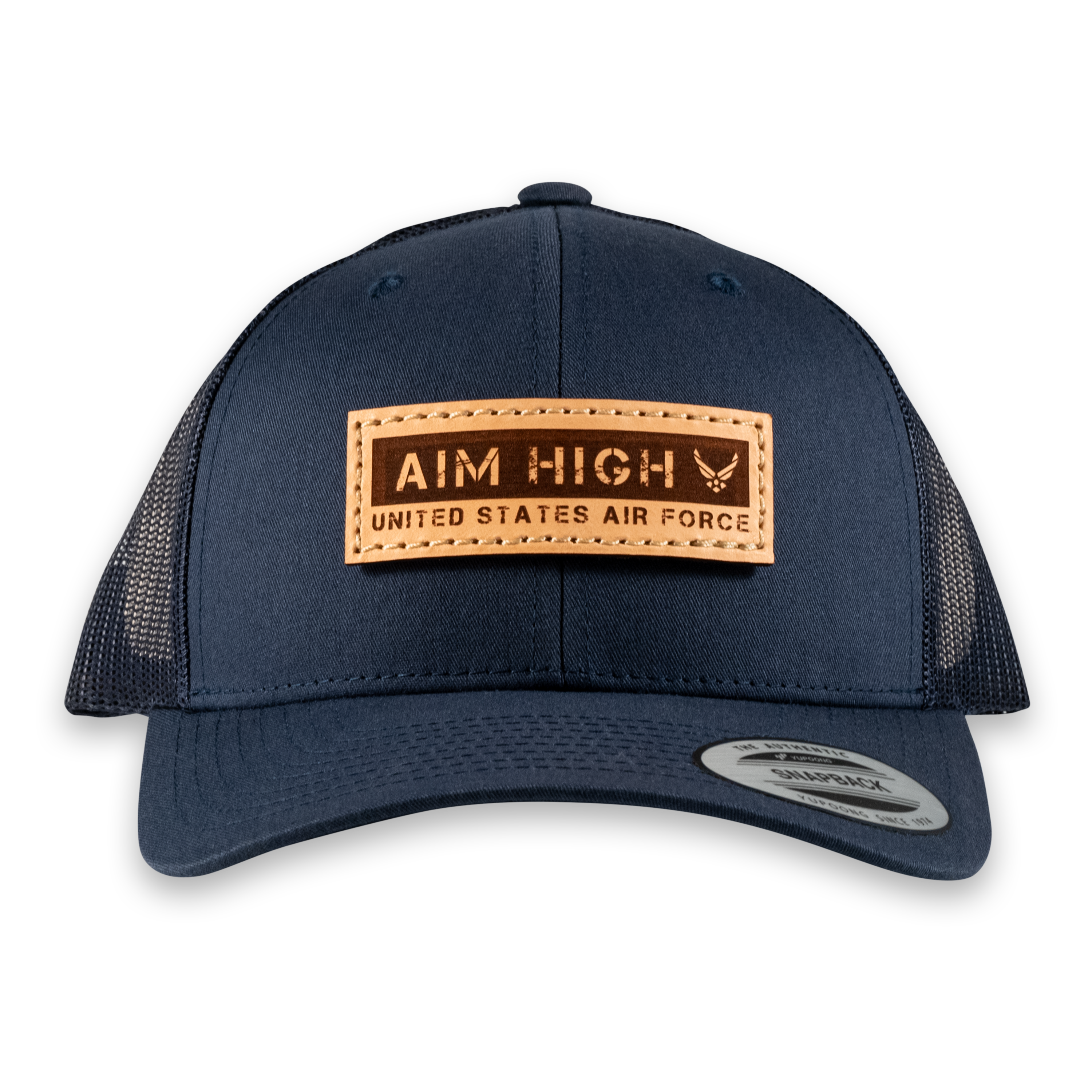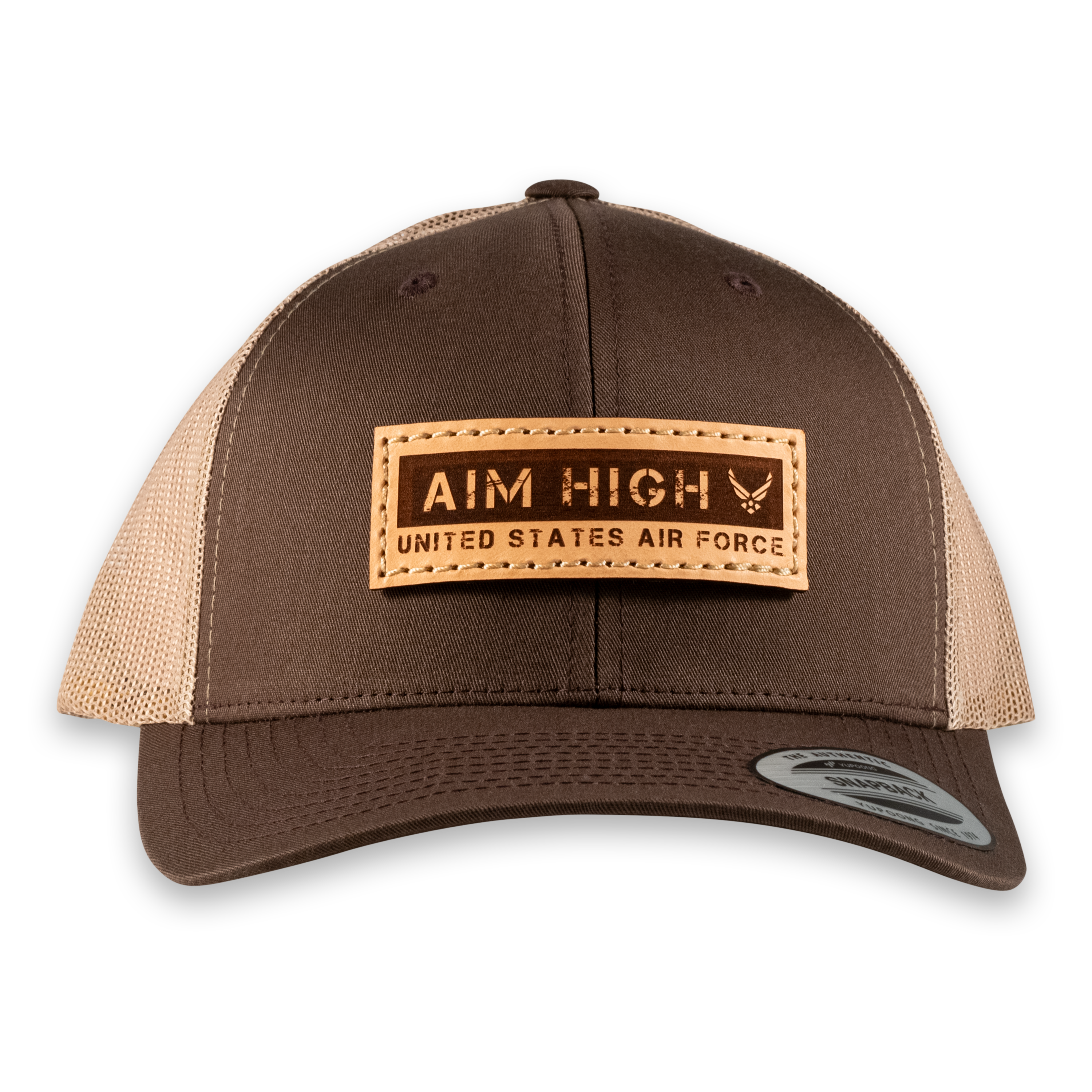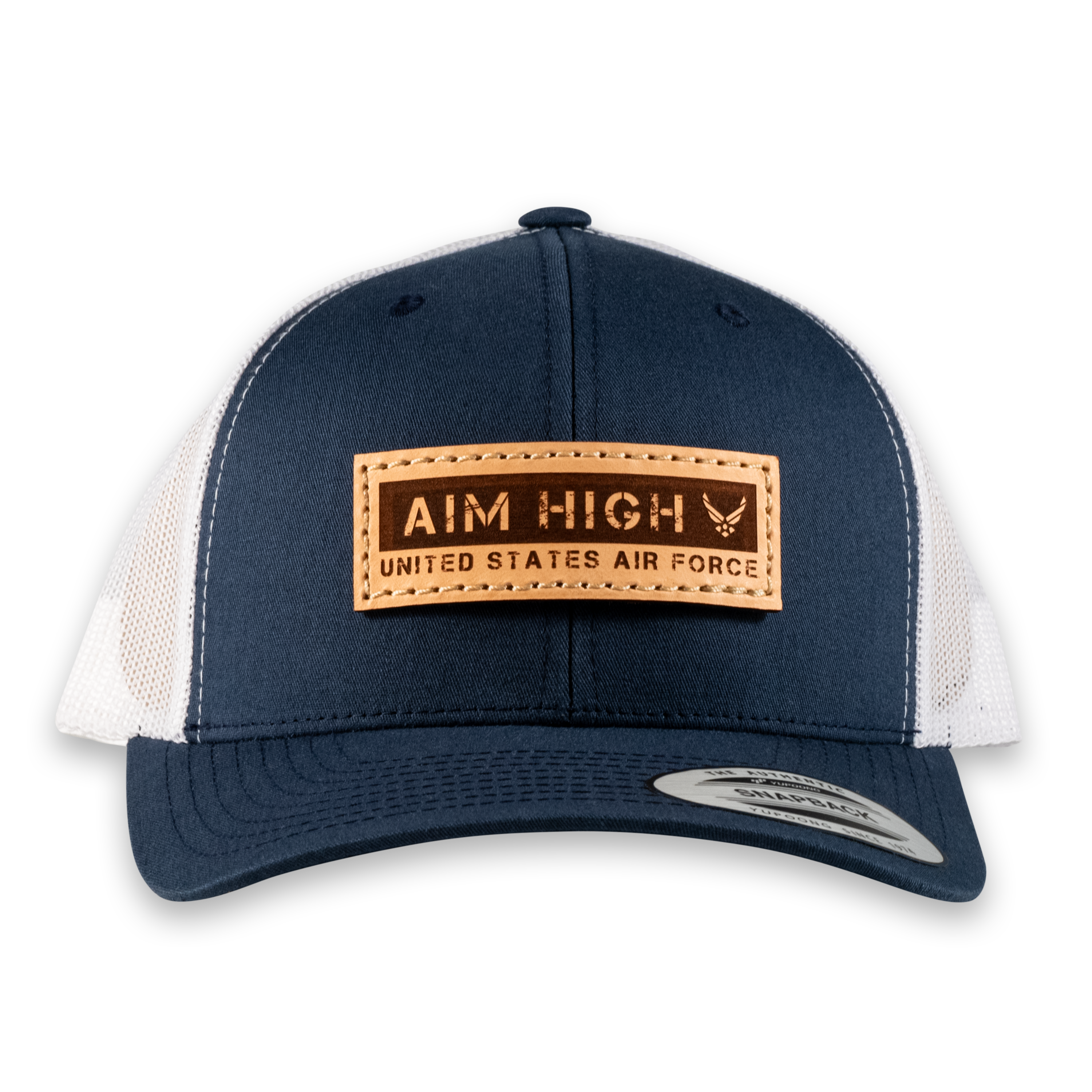 Hand Stitched Aim High Rectangle Custom Leather Patch Hat. Officially licensed by the U.S. Air Force.