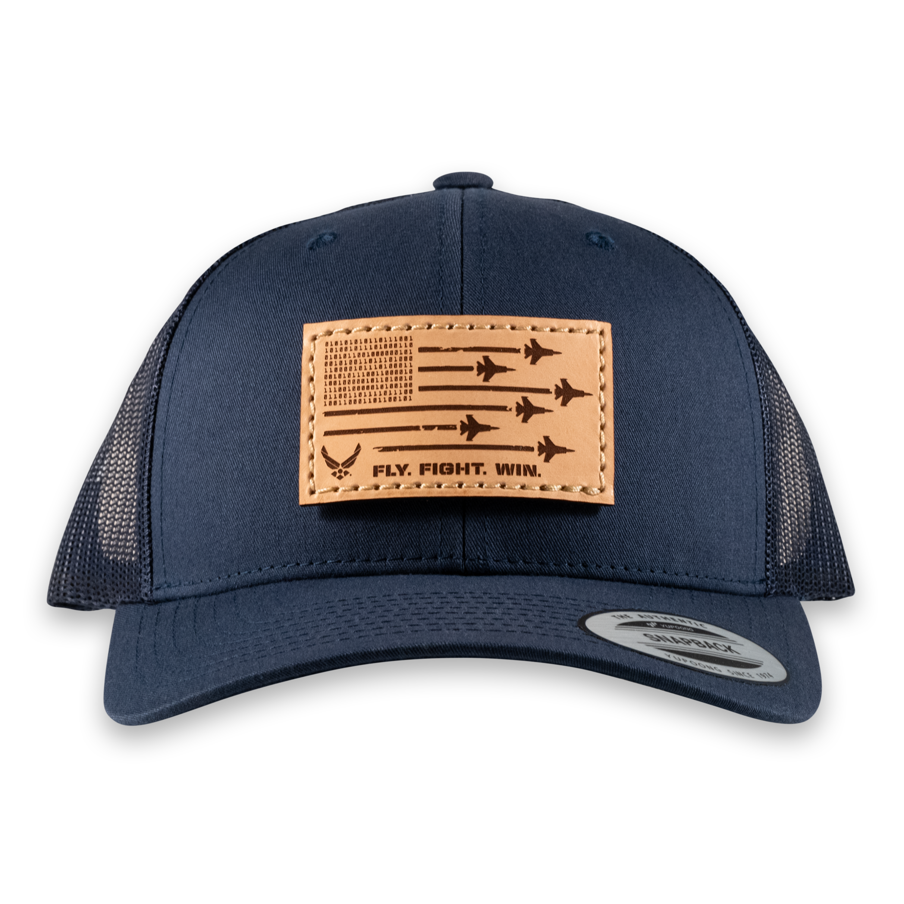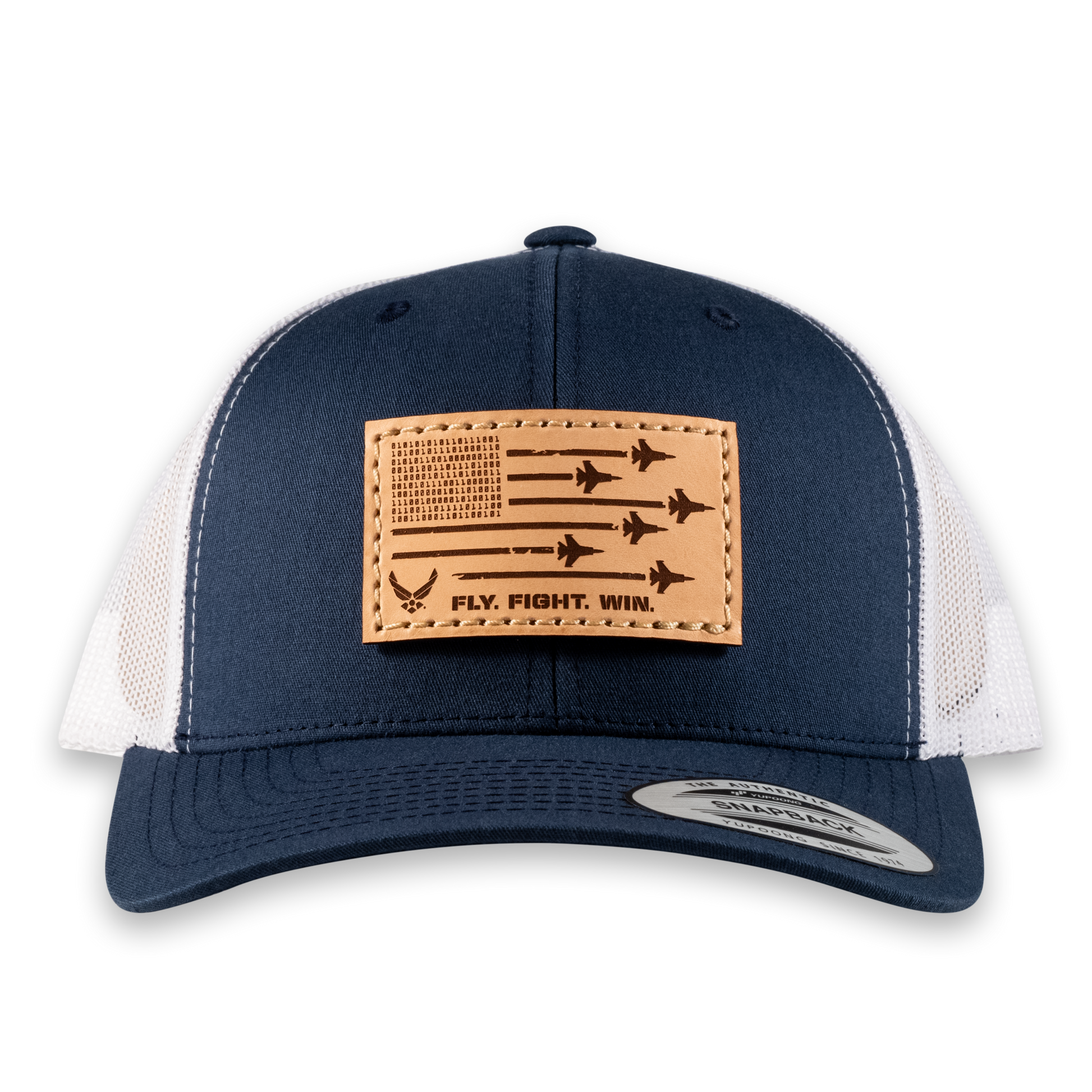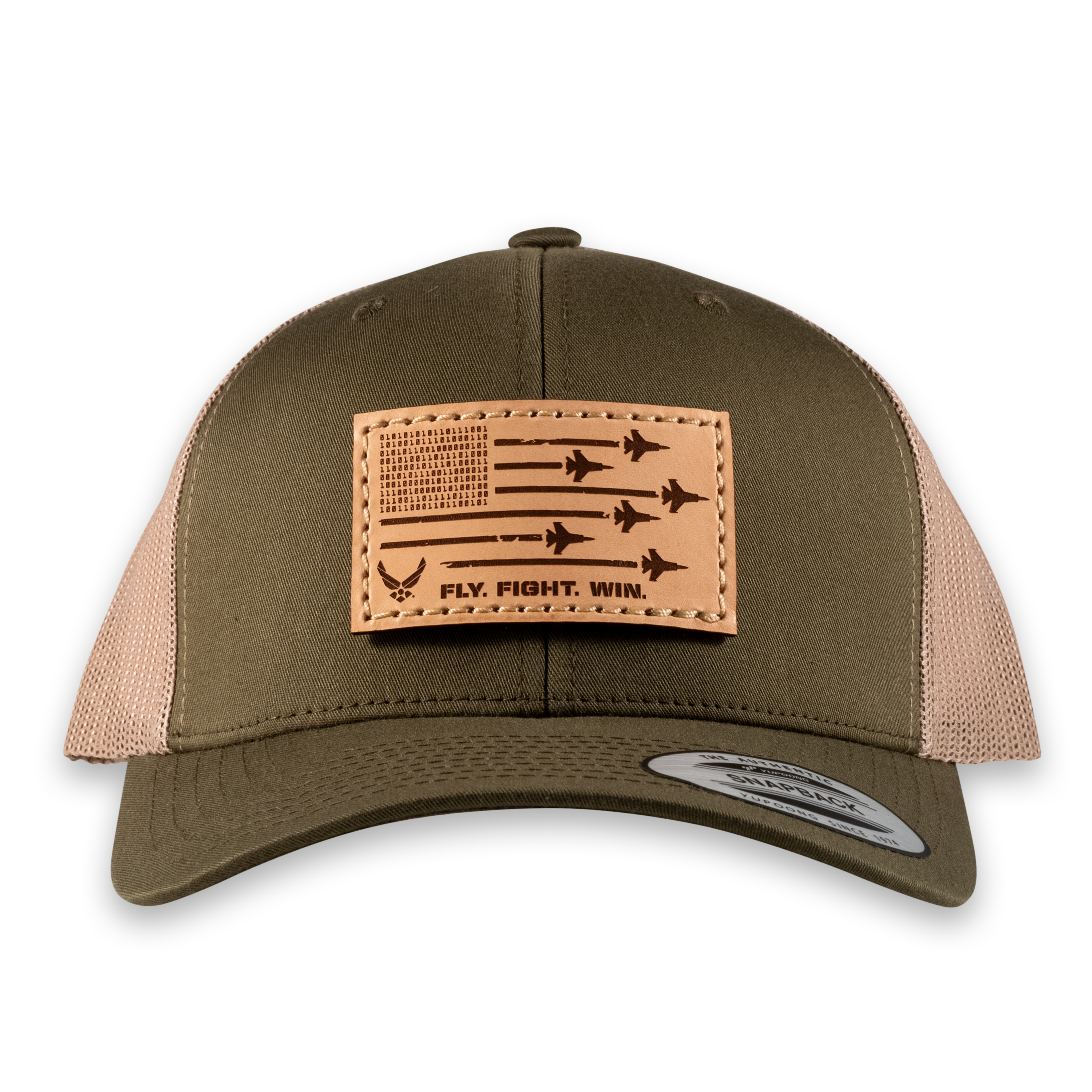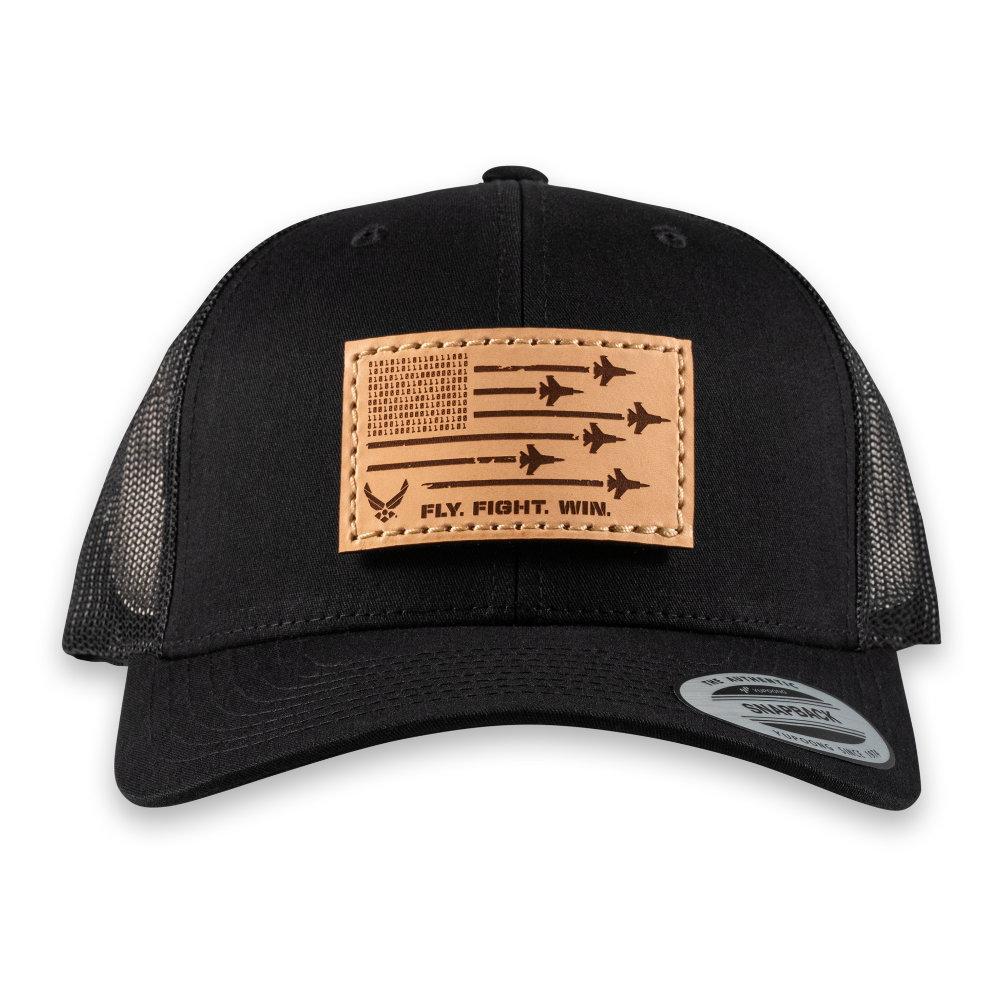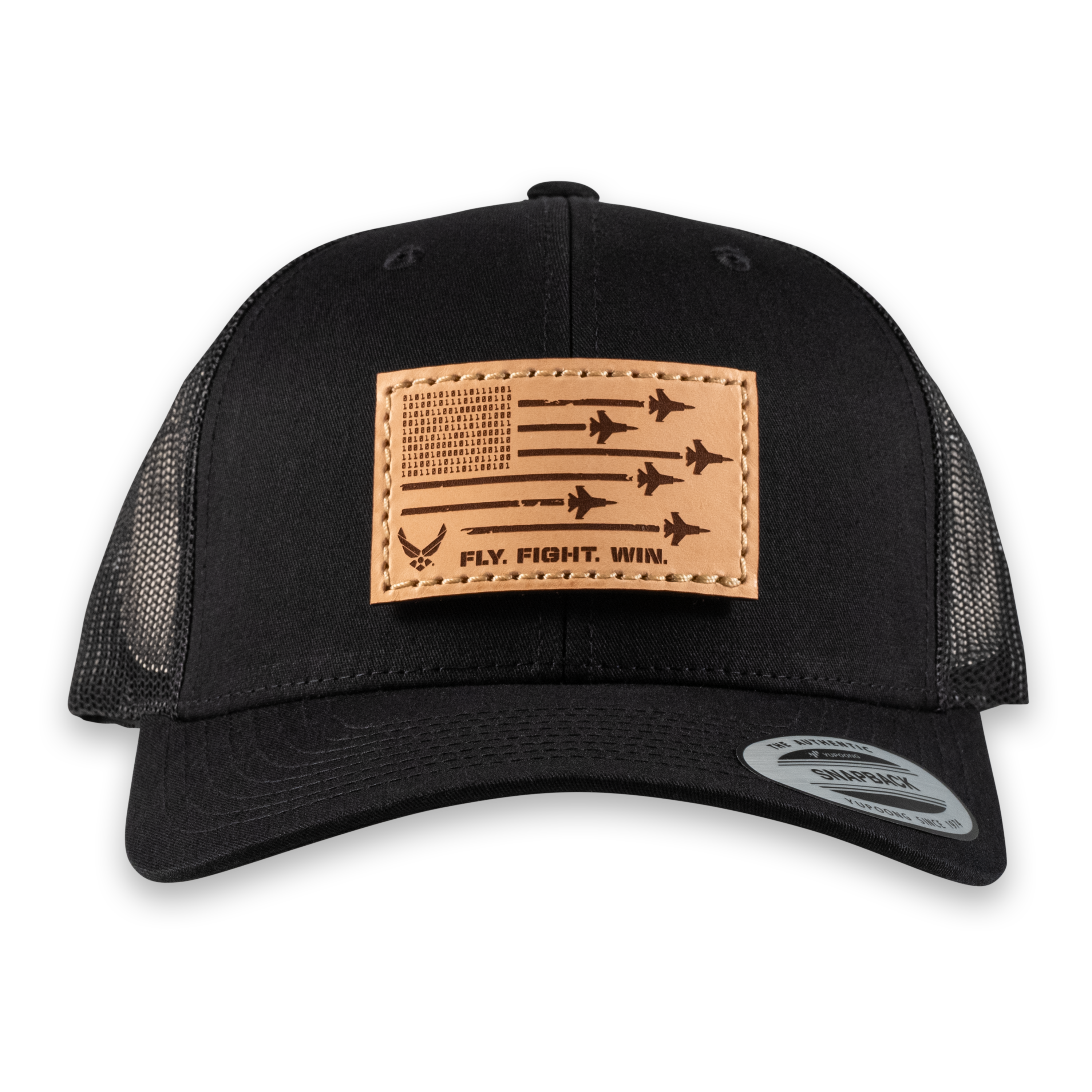 Hand Stitched Fly Fight Win Custom Leather Patch Hat. Officially licensed by the U.S. Air Force.